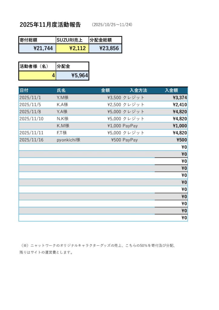 11月も変わらず、あたたかいご寄付、応援をいただきありがとうございます。